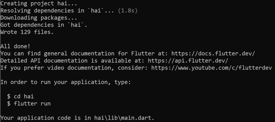 Buka terminal atau cmd, kemudian ketikkan perintah flutter create nama_proyek, maka proyek flutter pertama dengan nama nama_proyek akan terbentuk, disini saya menggunakan nama proyeknya yaitu hai