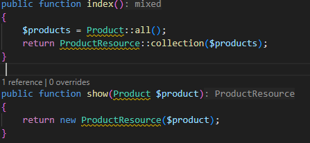 9. Selanjutnya, edit bagian index dan show menggunakan API Resource pada ProductController.php dan tambahkan import ProductResource menggunakan use.