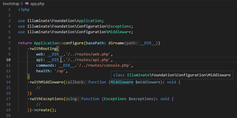 10. Kemudian pada bagian file app.php di folder bootstrap tambah kan api agar Laravel tahu bahwa file routes/api.php harus di-load sebagai route API. Jika tidak ditambahkan, maka route di routes/api.php tidak akan aktif/terdaftar – dan saat dicoba untuk diakses /api/products, maka hasilnya akan 404 Not Found.