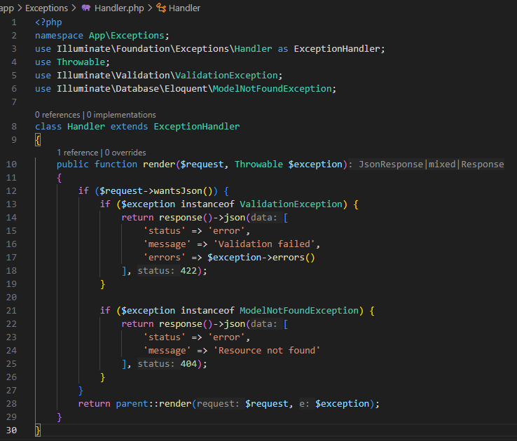 12. Setelah itu buat folder baru didalam app dengan nama Exception dan jalankan perintah php artisan make:exception Handler yang akan digunakan untuk menangkap dan menangani semua exception/kesalahan yang terjadi di aplikasi secara terpusat, masukkan kode berikut pada file handler