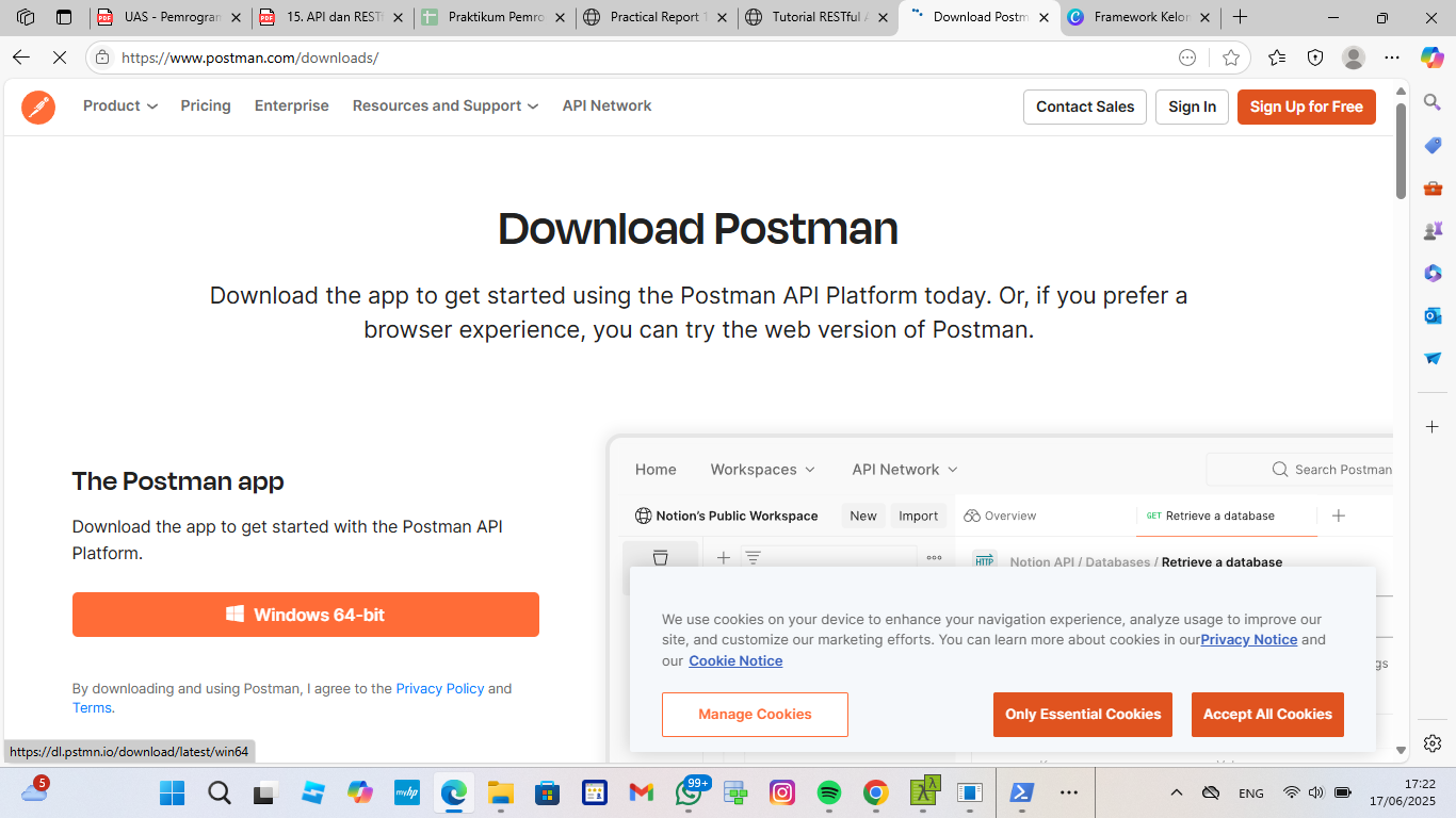 13. Kemudian untuk melakukan pengujian API ini download aplikasi postman dari website resminya seperti berikut ini