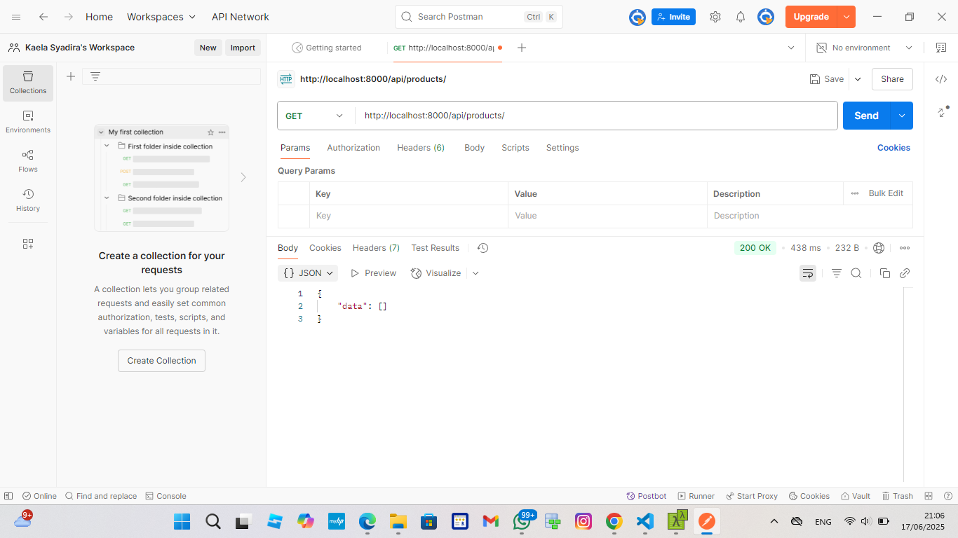 14. Setelah berhasil diinstal pilih bagian "Send and API request". Setelah itu pada terminal jalan kan perintah php artisan serve untuk mengambil url dan mengcopy nya pada bagian send and api request tadi dan tambahkan route yang sudah kita buat dan gunakan methode GET untuk mengambil data dan jika berhasil akan muncul hasilnya seperti dibawah ini