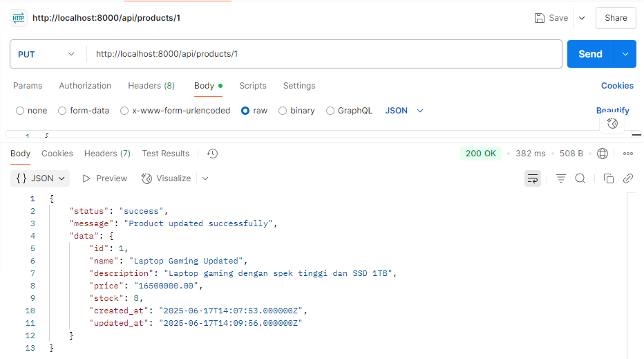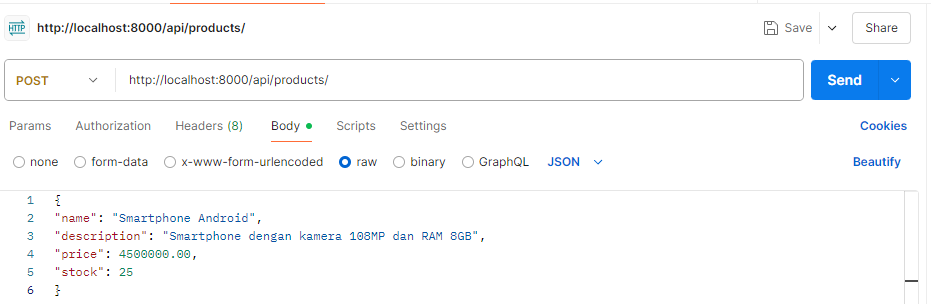 16. Contoh lainnya, setelah menambahkan data tersebut kita coba menggunakan GET kembali dengan menambahkan id setelah products pada url dan hasilnya akan seperti ini