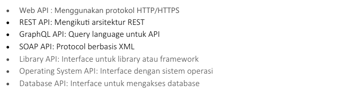 API (Application Programming Interface) merupakan sekumpulan aturan dan protokol yang memungkinkan aplikasi berbeda platform untuk berkomunikasi dan saling terintegrasi.