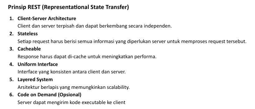 REST (Representational State Transfer) adalah arsitektur untuk merancang web services. REST bukan protokol atau standar, melainkan seperangkat prinsip desain.