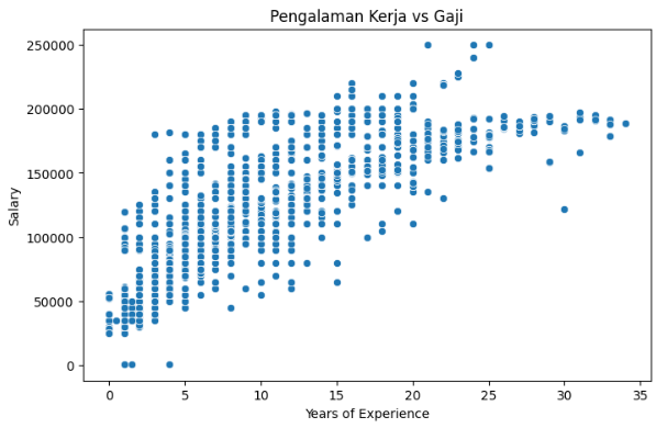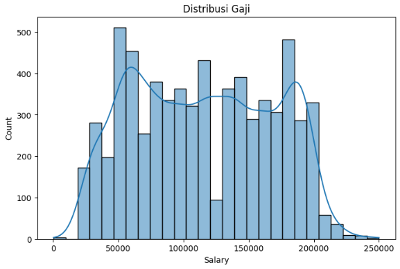 Tahap EDA dilakukan untuk memahami pola data, distribusi gaji, serta hubungan antara fitur dan target.