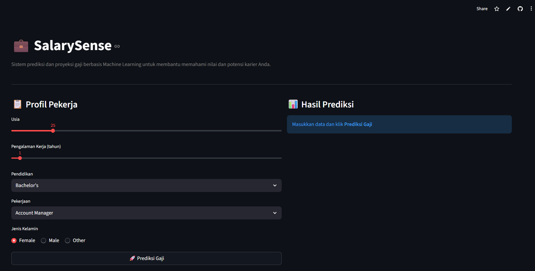 Model terbaik di-deploy ke dalam aplikasi web interaktif menggunakan Streamlit. Aplikasi ini memungkinkan pengguna untuk: